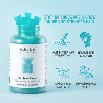 hese specially formulated hair gummies are packed with 5,200mcg Biotin formulated with Zinc and Pantothenic Acid to support hair growth and vitality. Unichi Hair Boost Gummy has a scientifically tailored formula containing multivitamins (Vitamin A, Vitamin C, Vitamin E). Each bear-shaped and delicious hair chewable vitamin has great sea salt & green grape flavor, working together to strengthen hair strands, promote scalp health, and enhance overall hair thickness.