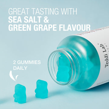Maltitol Syrup, Maltitol, Isomalt, Gelatin, Purified Water, DL-Malic acid, Calcium Pantothenate (Pantothenic acid), L-ascorbic acid (Vitamin C), Zinc Gluconate (Zinc), Agar, Flavours (Sea salt, Green grape and Lemon Flavour), DL-α-Tocopheryl acetate (Vitamin E), Citric Acid, d-Biotin (Biotin), Antisticking Oils (Medium Chain Triglycerides, carnauba wax), Vitamin A (Retinol), Brilliant blue FCF.